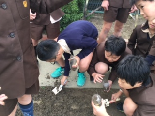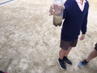 粘土層の土や砂、礫など種類の違う土を集めています。実験に使うようです。大地のでき方、堆積土などの学習です。