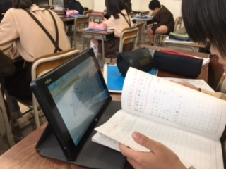 「面積」の学習を習熟度別少人数指導で行なっています。今日はその1つのクラスで研究授業を行いました。タブレットの良さを活かしながら、算数科でつけたい力をつけていくにはどうすればよいかといった提案型の授業でした。N先生は、校内で一番よくタブレットを使った授業をしています。