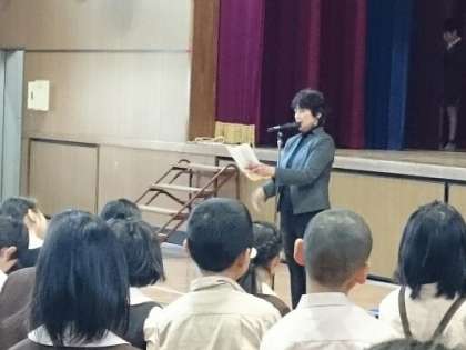 今日の朝会は読書感想文の表彰から始まりました。夏休みの課題として取り組んだ読書感想文で、見事6人が表彰を受けました。毎週、何かしらの表彰があり、大宮小学校の子どもたちはよくがんばっています。次に校長先生から人権週間に関連しての作文が読まれました。