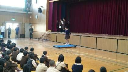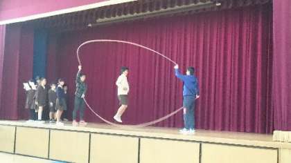 校長先生の話の後、体育委員会のなわとびの発表がありました。個人の大技「はやぶさ」、大縄を使った「八の字とび」「ダブルダッチ」を全校に披露しました。どの技も見事!で、見ている人たちに憧れを抱かせるには十分なほどでした。なわとび週間が始まったので、今日の体育委員のようになわとびを楽しんでほしいと思います。