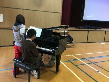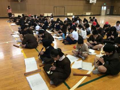 5・6年生が終業式の音楽発表に向けて、講堂で練習しました。リコーダーでパッヘルベルのカノンに挑戦しています。有名だけどとても難しいあのメロディー。みんな必死に食らいつき、だいぶできるようになってきました。3つのパートの音が重なりあい、天井が高い講堂の空間にきれいに響いていました。