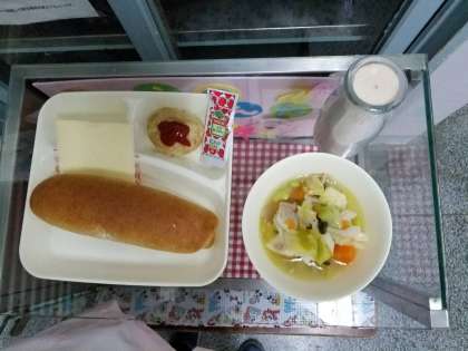 今日の献立は、豆腐ハンバーグ、スープ煮、スライスチーズ、ライ麦パン、牛乳です。