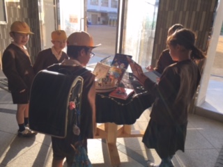 玄関にできた図書コーナー。管理作業員さんが、移動式の丸いテーブルを作ってくれました。クリスマスのディスプレイをして、本を並べました。早速登校してきた子ども達が見つけ、読んでいます。