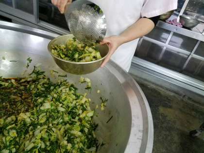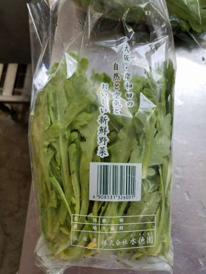 きくなと白菜のごま和えは、今が旬のきくなを使用しています。きくなは、きくの葉の形に似ていて特有の香りがあり、全国の生産量は、大阪府が千葉県についで2位で、なにわ特産品の1つになっています。