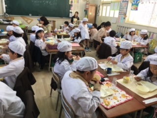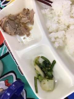 豚肉の生姜焼きは、子ども達に大人気のメニューです。生姜や玉ねぎの風味が効いていて、ご飯が進みます。1年生は、野菜もモリモリ食べていました!