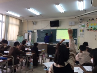 「どのように変わるか調べよう」の学習です。裏と表の時計盤の針が示す数字が、どのような関係になっているか調べ、関係を式に表します。言葉で表していることを式にしたり、一般化するのはなかなか難しいですが、一つ一つたしかめ、気づいたことを発表して式に表すことができました。