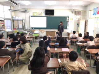 掃除の後、イングリッシュタイムです。元気な声が。聞こえています。小文字の書き方を体を使って覚えています。
