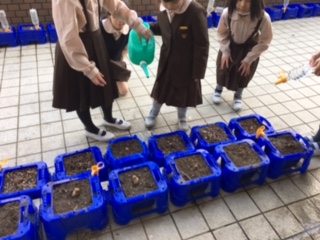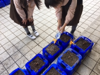 スイセンがほんの少し芽を出しています。「明日は、土曜日だからしっかりお水をあげよう」と子ども達。