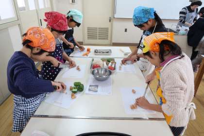 前回と同様、ニンジンやピーマンを型抜きしたり、ウインナーを「タコさんウインナー」にしたりして材料の下ごしらえをしました。料理の仕方を教えてもらいながら、てきぱきと作業が進みます。