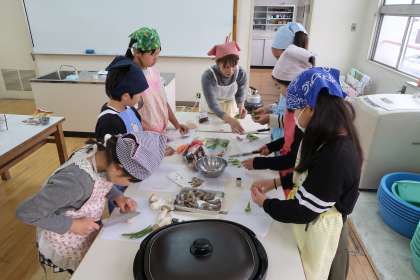 今日は、生涯学習ルーム主催のキッズ料理教室が家庭科室で開かれました。4年から6年の子どもたちが参加し、パエリアとヨーグルトドリンク作り方を教えていただきました。