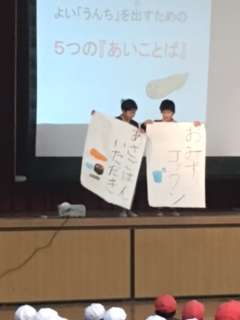 最後に「よいうんちを出すための5つの合言葉」を発表しました。1.朝ごはんいただき 2.お水ごっくん 3.やさいモリモリ 4.体のびのび 5.うんちタイム です。