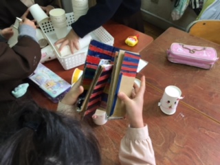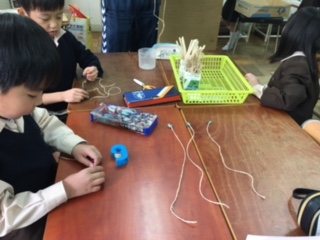 「おもちゃランド」を開いて1年生を招待します。班ごとに手作りおもちゃを作っています。1年生が喜んでくれるかなとワクワクしています。