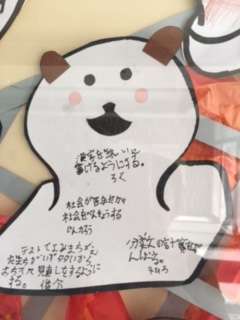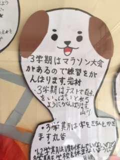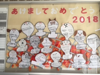 今月は4年生が担当です。かわいい犬の形に、それぞれ今年のめあてが書いてあります。一歩一歩、着実に前進!!ガンバレ!!