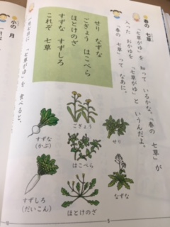 「春の七草」「小の月」について勉強しました。「春の七草」は、覚えて校長先生に言うと、スタンプがもらえますよ!がんばってね!