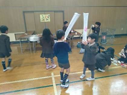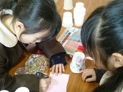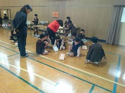 1年生がお客さまとしてやって来ました。お店を開いている2年生は自分たちで作ったおもちゃを使って一緒に遊んだり、1年生にゲームを楽しませたりしていました。また、1年生に作り方を教えて、一緒におもちゃを作るグループもいました。