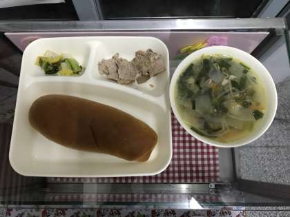 今日のメニューは豚肉のオイスターソース焼き、糸寒天のスープ、ピリ辛あえです。