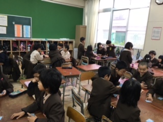 グループ毎に百人一首を行いました。五色百人一首の中で、子ども達が一番よく覚えているのは青のカードです。でも、他の色のカードでも、上の句の一番初めの文字を読んだだけでさっと取れる子もいます。お正月、お家でも家族対抗でやったのでしょうか?