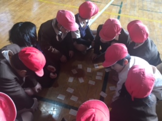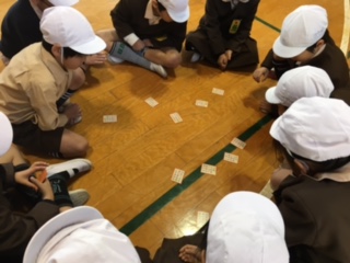 たてわり班で、百人一首をしました。低学年と高学年の2つのグループに分かれて対戦しました。低学年でもたくさん取っている様子に驚いた高学年の子ども達。やさしくアドバイスをくれる上の学年のお兄さん、お姉さんを頼もしく思った小さい子達。お互いよい刺激をもらっています。