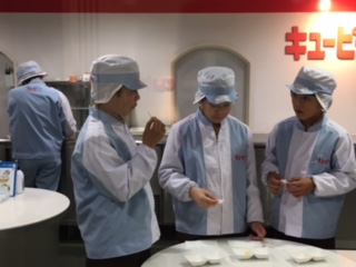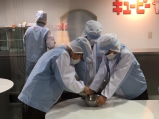 焼きおにぎり作り、マヨネーズ作りを体験しました。マヨネーズは、たまご、塩、酢、油で作りますが、混ぜ方や油を入れるタイミングによって味が違うそうです。出来上がった物と、市販のマヨネーズを食べ比べてみました。