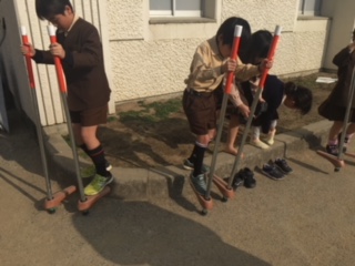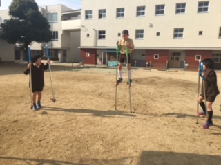 新しく竹馬を購入しました。土曜日、早速たくさんの子どもたちが挑戦していました。保育所などで経験したことがあるという子は、とてもじょうずです。