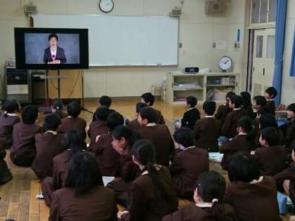 まず、音楽集会で歌う「しあわせ運べるように」と「花が咲く」を歌いました。2年生が6年生の美しい歌声をお手本にして、どちらの歌も心を込めて歌えました。