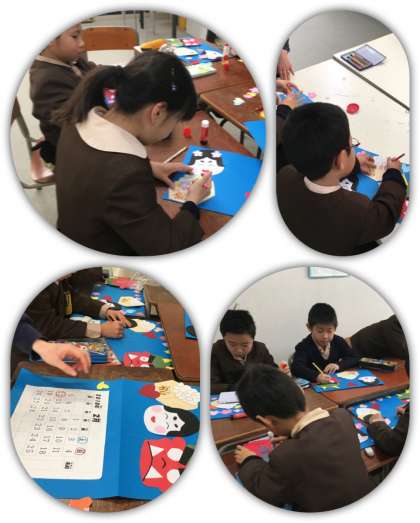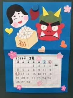 「おにはうち、ふくはそと」という絵本の読み聞かせを聞いた後、2月のカレンダーを作りました。素材はみんな同じでも、組み合わせ方や鬼の目の書き方などで、一人一人の個性が出ています。ステキなカレンダーが出来上がりました!