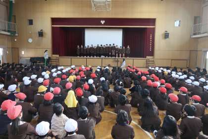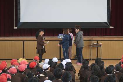 最後に、給食調理員さんへ、給食委員会の人が代表して感謝の言葉を伝え、各クラスで作ったカレンダーをプレゼントしました。プレゼントを受け取った調理委員さんからは、「かぜなどもはやっているので、給食を好ききらいなく食べてください」と話されました。