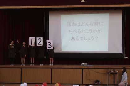 学校給食が明治22年山形県から始まったことや、コッペパンの大きさが学年によって違うこと、「豚肉はどんなときに食べると効果があるでしょう」などのクイズを通して、給食についてわかりやすく教えてくれました。