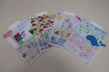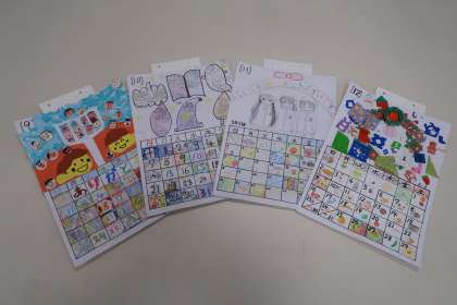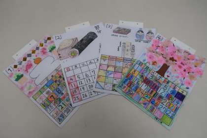 給食調理員さんに贈った、各クラスからのカレンダーです。クラスのみんなでひと月分のカレンダーを作りました。それを給食室で使ってもらいます。
