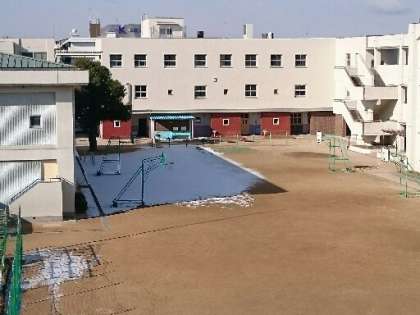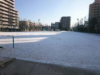 運動場にビオトープ、一面の雪に覆われています。時間が経っても、日かげのところの雪はしっかり残っています。雪のおかげで、日なたと日かげの温度のちがいが一目でわかります。