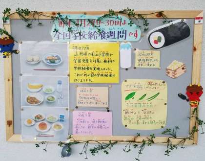 給食室前の掲示板には、調理員さん作成のマメ知識や、給食週間のことがのっています。
