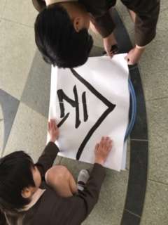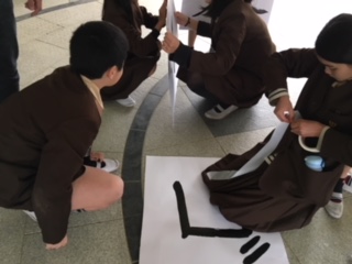 文字盤を重ねてテープで留めています。紐を通してポールにくくりつけるのは、管理作業員さんがやってくださいました。
