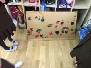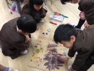 幼稚園、保育所との交流会でするゲームを作っています。手作りの味わいがありますね。1年生の子ども達は、小さい子を迎えるために一生懸命アイデアを出し合っています。