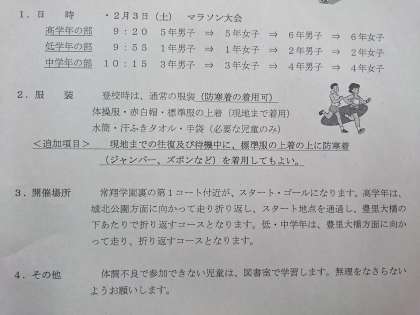 本日のマラソン大会、応援よろしくお願いします。暖かい服装でお越しください。