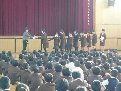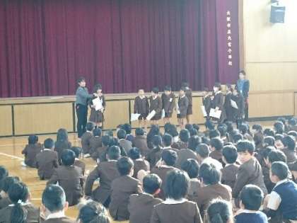 今日の朝会では、土曜日のマラソン大会の表彰式を行いました。各学年男女5位まで60人が前に出て表彰状を受け取りました。恒例のインタビューは1位の人が発表しました。
