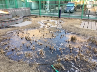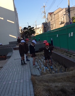 登校中にビオトープの氷を見つけた子ども達。早速田んぼに入ってジャンプ!でも今朝の氷は分厚くて、びくともしません。池の水が少なくなってきたので、昨日管理作業員さんが、水を足してくれました。池もカチンカチンに凍っています。メダカはどうしているのかな?