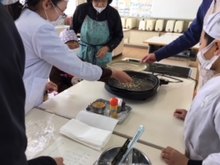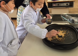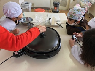 先週ひまわりタイムで計画したポップコーン作りの実習です。エプロンをつけて、作り方を確認した後、ホットプレートに、ほぐして干しておいたとうもろこしを1人スプーンに2杯ずつ入れていきます。タイムを計る係も準備OK。しばらくすると、ポン、ポポン、ポン!と、とうもろこしがはねている様子が伝わってきました。みんなは、わくわくしながら出来上がるのを待ちました。