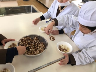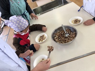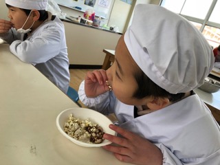 今月生まれた友達のお祝いをした後、みんなで「いただきまーす!」冷めても美味しいポップコーンに、みんな大満足!仲良く助け合って、上手にできました!!お家でも挑戦してみてね!