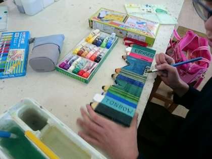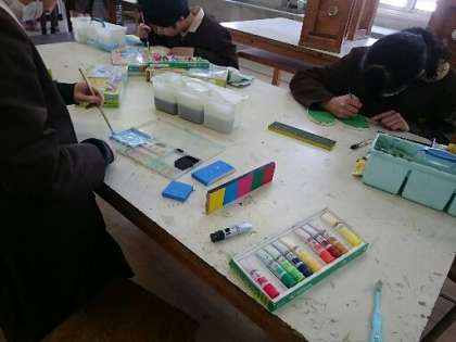 セロテープ台づくりも仕上げの段階に入っています。絵の具で自分が考えたデザインを色鮮やかに塗っています。卒業の記念となる作品です。お家で大事に使ってください。