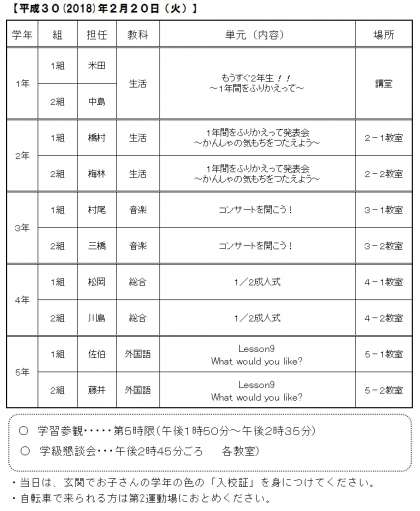 先日ご案内させていただいた通り、明日2月20日(火)に1〜5年生の学習参観・学級懇談会を行います。学習参観の内容は下記のようになります。