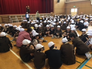 集会委員会児童による「なぞなぞ」ゲームでした。縦割り班のみんなで答えを考えます。