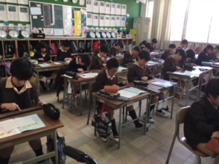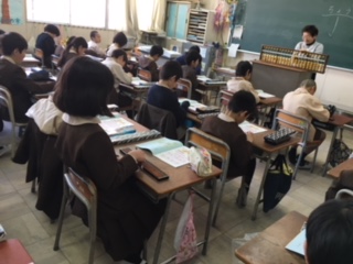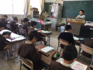 初めてのそろばん学習。本校卒業生で先日も創立記念集会でお話しいただいたUさんに、そろばんの初歩を教えていただきました。Uさんは、地域でそろばん教室を開いておられ、3年生の中にも何人か習っている子もいます。