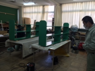 管理作業員さんが、あまりの板などを工夫して高学年の整理棚を作ってくださっています。絵の具セットなどの片付けがしやすくなり、きれいになりますね。