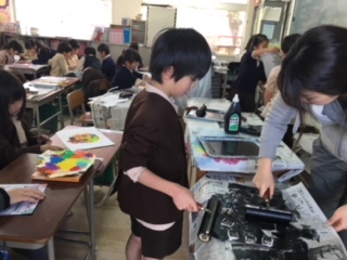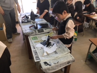 紙版画を刷っています。初めてのことなので、ローラーで付けたインクが手や服につかないように気をつけながら、バレンでしっかりこすりました。出来上がりが楽しみです!