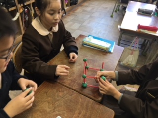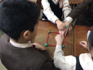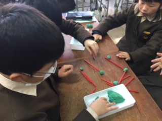 ストローと粘土の玉を使ってはこの形を作っています。どことどこのストローの長さを同じにしたら良いかなど試行錯誤しながら、グループで完成させていきました。初めから言われたとおりにするのではなく、自分でいろいろやってみると、たくさんの気づきがあります。