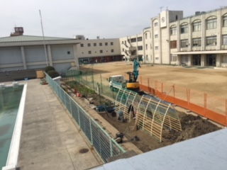 プールに出入りするためのスロープ工事が今週から始まりました。基礎工事を行っています。給食室側から入って真ん中あたりからプールサイドに入ることができるようにする予定です。