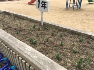 秋に植えたチューリップの芽が少しずつ大きくなってきました。4月には、教室も花壇も新しい一年生に譲ります。チューリップが大きく咲く準備をしているのと同じく、二年生になるための準備を今しっかりしている一年生です。