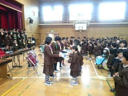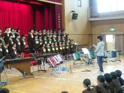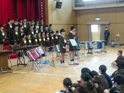 たくさんのものをプレゼントされた6年生からのお返しです。一人一人が縫ったぞうきんが在校生に手渡されました。あいさつの言葉に続いて、歌と合奏のプレゼントです。音楽が大好きで、これまでたくさんのすてきな演奏を披露した6年生のラストステージです。