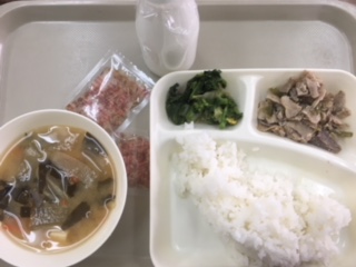 今日の献立は、豚肉の梅風味焼き、味噌汁、菜の花のおひたし、ご飯、牛乳です。