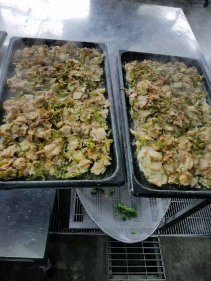 豚肉は、ピーマン、砂糖、料理酒、濃い口しょうゆ、梅肉を合わせて下味をつけ、焼き物機で焼きます。ほんのりと梅の風味がします。